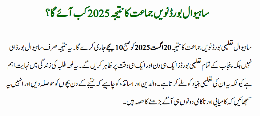 Sahiwal Education Board will release the result of Class IX on 20 August 2025 at 10 am. This result will be declared not only by Sahiwal Board but by all education boards of Punjab on the same day and at the same time. This moment is very important in the life of the students as it sets the foundation of their education. Parents and teachers should encourage children on the day of results and make them understand that both success and failure are part of moving forward.