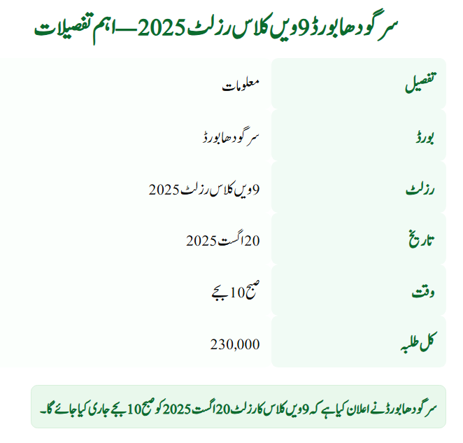 Sargodha Board 9th Class Result 2025 August 20 at 10 am will be released. This day will be very important for thousands of students and their families. Successful students should continue to work harder while those whose results are not as expected should not be disheartened. Real success lies in learning from each test and performing better in the next one. Remember, one exam doesn’t decide your whole life. Real strength lies in patience, courage and dedication.
