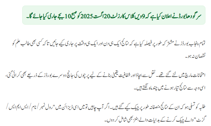 The Sargodha Board has announced that 9th Class Result on 20 August 2025 at 10 AM will be released. All the Punjab Boards have jointly decided to release the results on the same day and at the same time so that no student is disadvantaged. The exams were held in March and the papers were also checked by other boards to prevent duplication and ensure transparency. That’s why it takes a few months for the results to be ready.