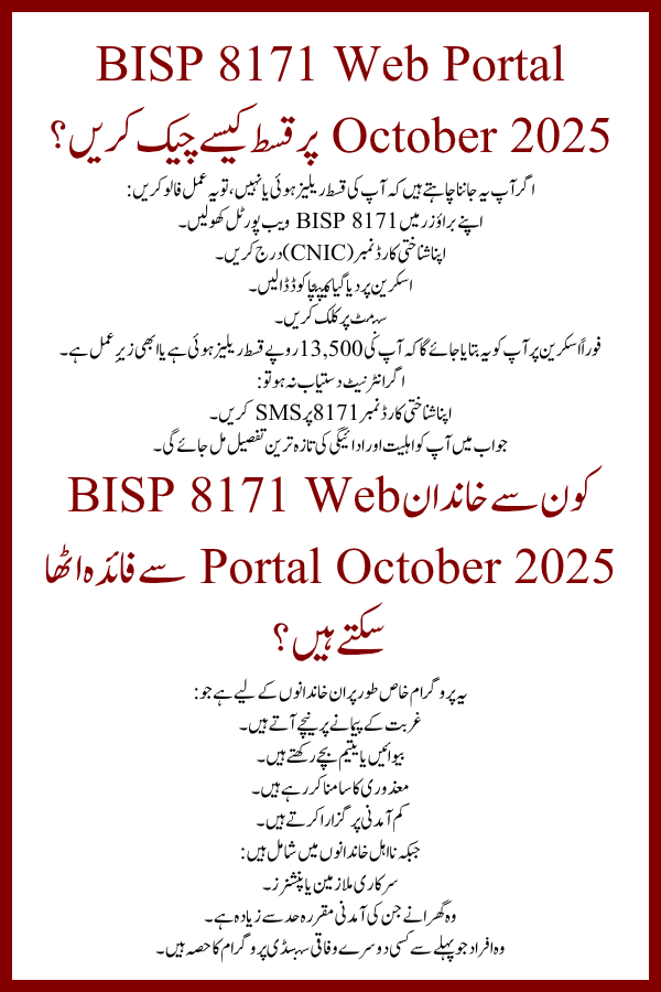 The BISP 8171 Web Portal October 2025 update has made it simple and transparent for families to confirm their Rs 13,500 installment. Whether you use the web portal or SMS, you can check your eligibility and payment status within seconds.