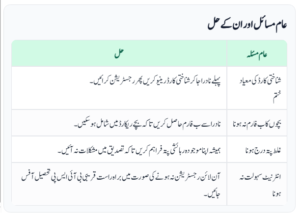 | Missing B-Form for children | Get the B-Form issued from NADRA to include children in the record. |