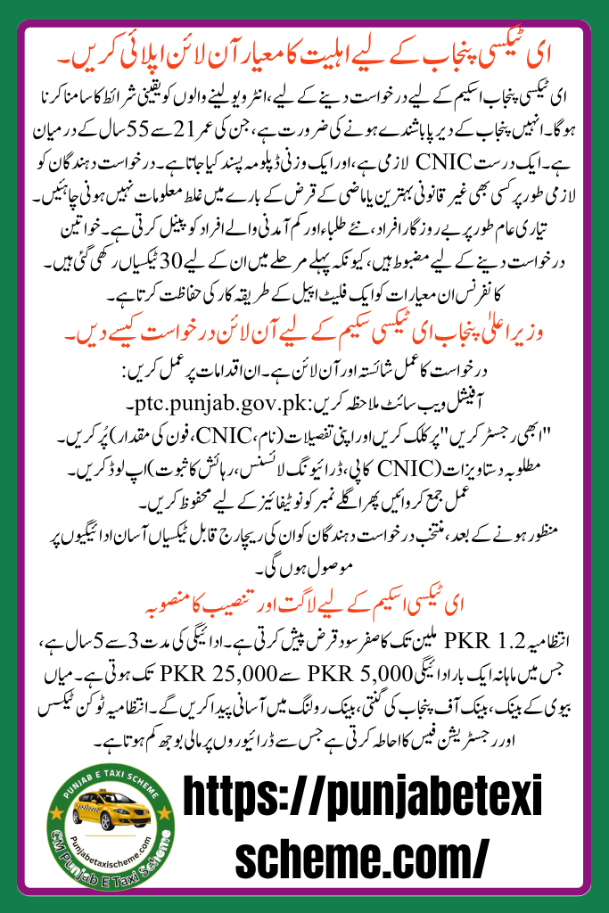 To apply for the E-Taxi Punjab Scheme, interviewees necessity encounter sure conditions. They need be lasting inhabitants of Punjab, old between 21 and 55 ages. A valid CNIC is compulsory, and a weighty diploma is favored. Applicants must not must any illegal best or past of loan elusions. The preparation typically panels unemployed individuals, new alumnae, and low-income earners. Women are fortified to apply, as 30 cabs are kept for them in the first phase. Conference these criteria safeguards a flat appeal procedure.