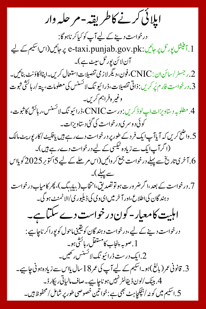 If you’re eligible and attentive, make sure to apply before October 5, 2025 via e-taxi.punjab.gov.pk, with all your leaflets in order. Don’t miss out — this could be life altering.
