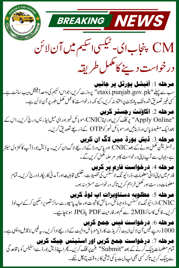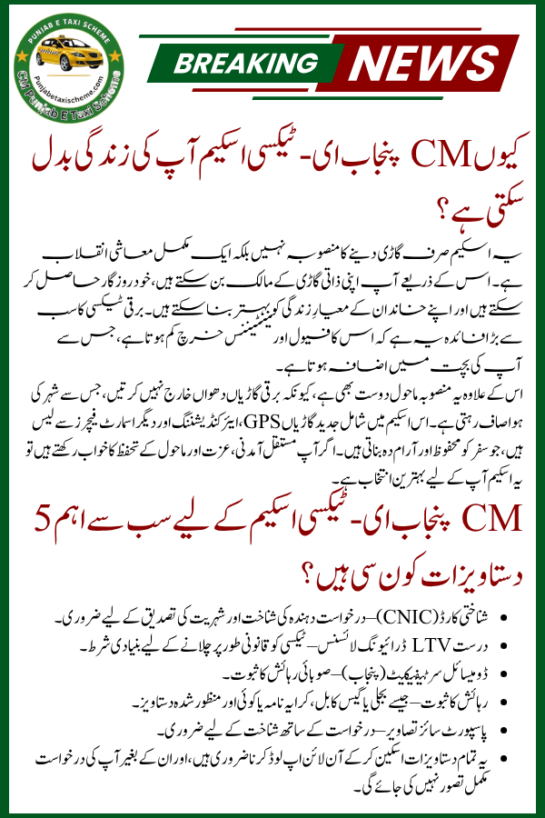 CM Punjab e-taxi scheme online application and login Not just an opportunity to buy a car, but a complete economic and social improvement project. The program empowers the youth, protects the environment and improves the quality of urban transport. If you are eligible, apply today and start your journey to success.