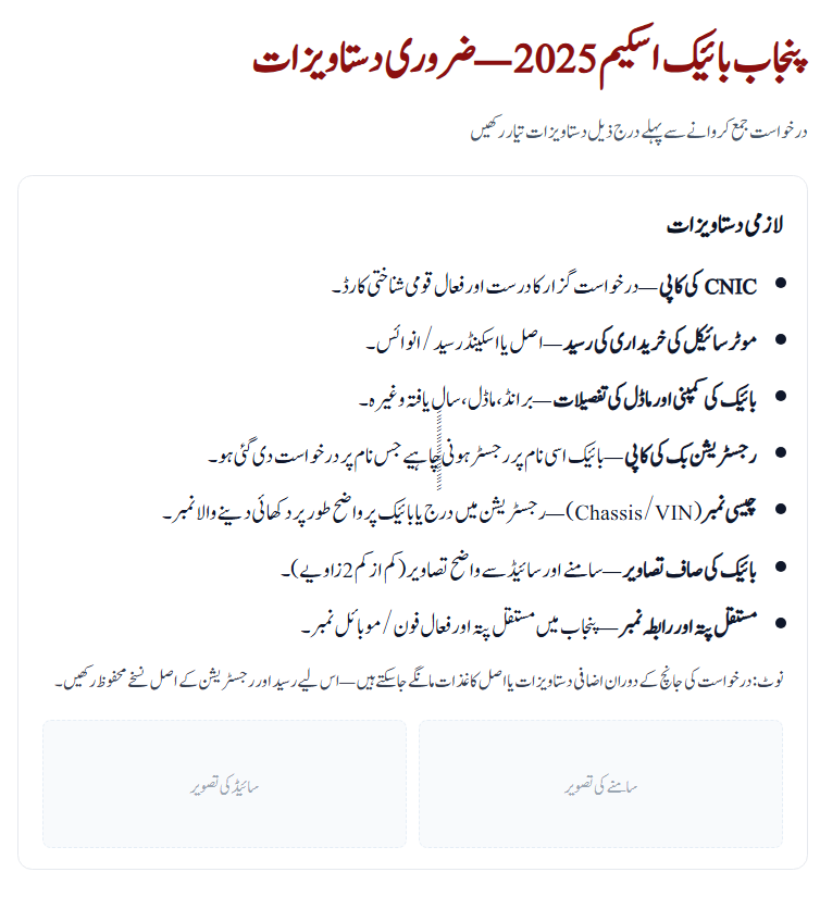 Required Documents to Apply in Punjab Bike Scheme 2025