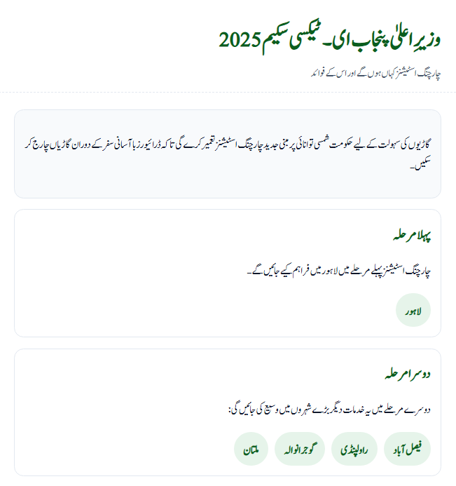 Under this scheme, the Punjab government will provide 1,100 electric taxis starting in August 2025. These taxis will be given on easy monthly installments without any interest, making it easier for drivers, company owners, and women to benefit and improve their financial situation. At the same time, this project will help reduce air pollution in cities and encourage the use of clean energy.